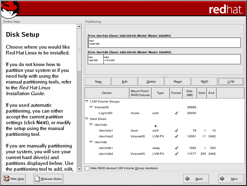 Click the LVM button to collect the physical volumes into volume groups. A volume group is basically a collection of physical volumes. You can have multiple logical volume groups, but a physical volume can only be in one volume group.