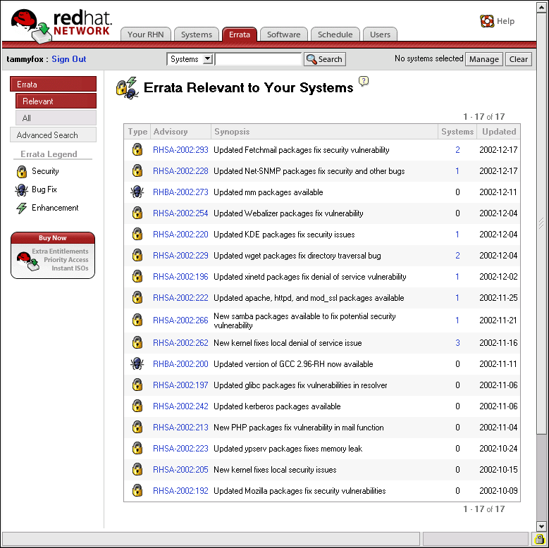 Errata Alerts — learn when Security Alerts, Bug Fix Alerts, and Enhancement Alerts are issued for all the systems in your network