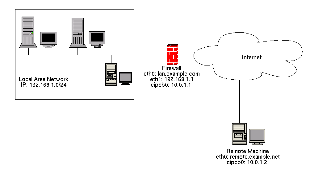 CIPE is a VPN implementation developed primarily for Linux. CIPE uses encrypted IP packets that are encapsulated, or wrapped, in datagram (UDP) packets. CIPE packets are given destination header information and are encrypted using the default CIPE encryption mechanism. The packets are then transferred over IP as UDP packets via the CIPE virtual network device (cipcbx) over a carrier network to an intended remote node. Figure 6-1 shows a typical CIPE setup connecting two Linux-based networks: