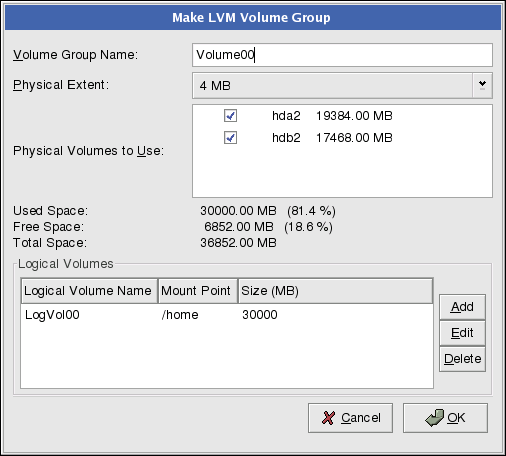 3. All logical volumes inside the volume group must be allocated in physical extent units. By default, the physical extent is set to 4 MB; thus, logical volume sizes must be divisible by 4 MBs. If you enter a size that is not a unit of 4 MBs, the installation program automatically selects the closest size in units of 4 MBs. It is not recommended that you change this setting.