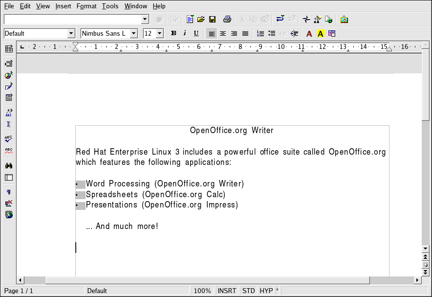 Red Hat Enterprise Linux includes a powerful business productivity suite called OpenOffice.org, which incorporates several complementary applications into one integrated package. Using OpenOffice.org is much faster and easier than learning complex tags and code to format your documents and presentations. It allows you complete control over the layout and content of your documents and lets you see the results as you edit it. This real-time, visual form of document formatting is called what you see is what you get (or WYSIWYG) editing.