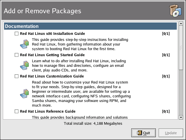 If you have the Red Hat Enterprise Linux boxed set, remember to take a look at the Red Hat Enterprise Linux Documentation CD. All of the Red Hat Enterprise Linux manuals are on this CD. Individual downloads of our documentation in HTML, RPM, PDF, and compressed tarball format (.tar.gz) are also available at http://www.redhat.com/docs/. Once you have logged in to your user account, inserting the Documentation CD in your CD-ROM drive should automatically start the Package Management Tool and allow you to install any of the Red Hat Enterprise Linux documentation. Follow the instructions and choose the documentation you would like to install.