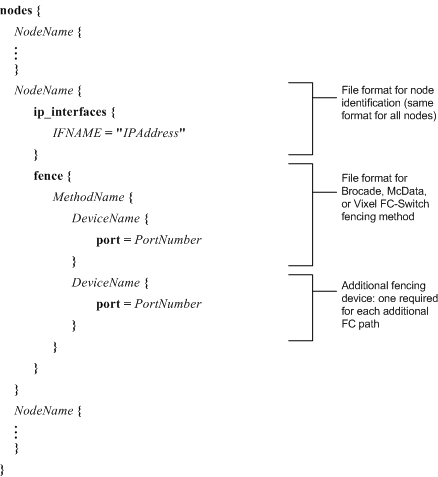 If using Brocade, McData, or Vixel FC-switch fencing, specify MethodName, DeviceName, and PortNumber. If you are configuring for multiple paths to FC storage, specify the following parameters for each additional fencing device required: DeviceName and PortNumber. Refer to Example 6-16 for a nodes.ccs file that specifies Brocade FC-switch fencing. Refer to Example 6-17 for a nodes.ccs file that specifies McData FC-switch fencing. Refer to Example 6-18 for a nodes.ccs file that specifies Vixel FC-switch fencing.