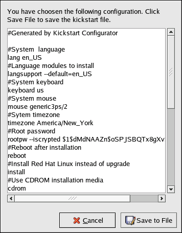 After saving the file, refer to Section 9.10 Starting a Kickstart Installation for information on how to start the kickstart installation.