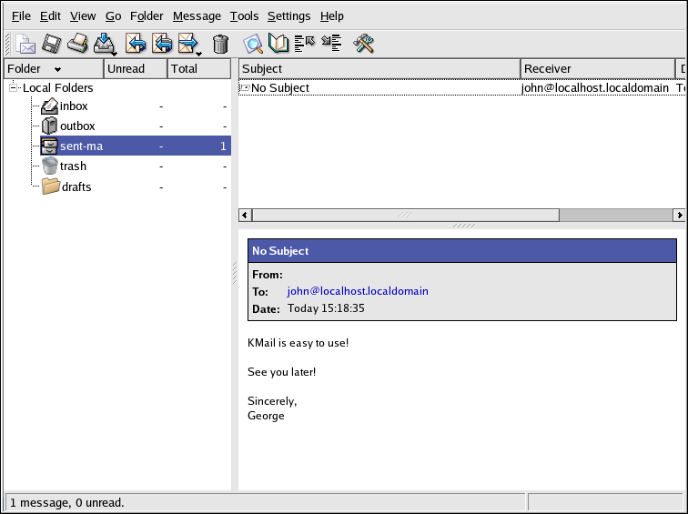 Once you have your email settings configured, you can begin sending and receiving email. The folders on the left side of the KMail screen allow you to view emails you have received, emails ready to be sent, emails you have sent, and more.