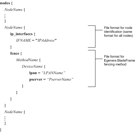 If using Egenera BladeFrame fencing, specify MethodName, DeviceName, LPANName, and PserverName. Refer to Example 6-22 for a nodes.ccs file that specifies Egenera BladeFrame fencing.