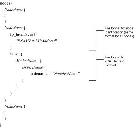 If using xCAT fencing, specify MethodName, DeviceName, and NodelistName. Refer to Example 6-21 for a nodes.ccs file that specifies xCAT fencing.