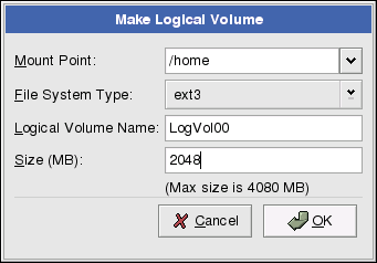 Create logical volumes with mount points such as /home. Remember that /boot can not be a logical volume. To add a logical volume, click the Add button in the Logical Volumes section. A dialog window as shown in Figure 13-3 will appear.