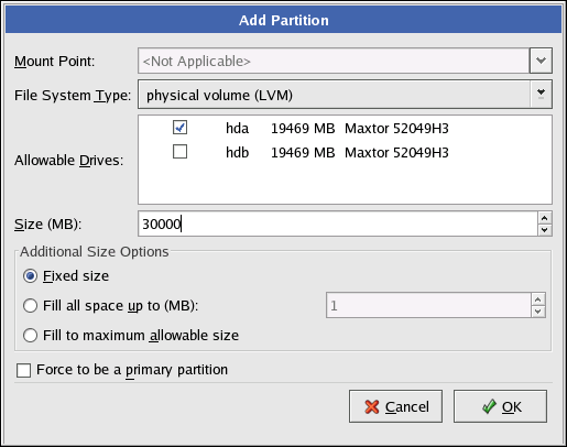 Select Fixed size to make the physical volume the specified size, select Fill all space up to (MB) and enter a size in MBs to give range for the physical volume size, or select Fill to maximum allowable size to make it grow to fill all available space on the hard disk. If you make more than one growable, they will share the available free space on the disk.