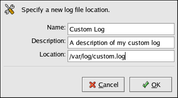 Provide a name, description, and the location of the log file to add. After clicking OK, the file is immediately added to the viewing area if the file exists.