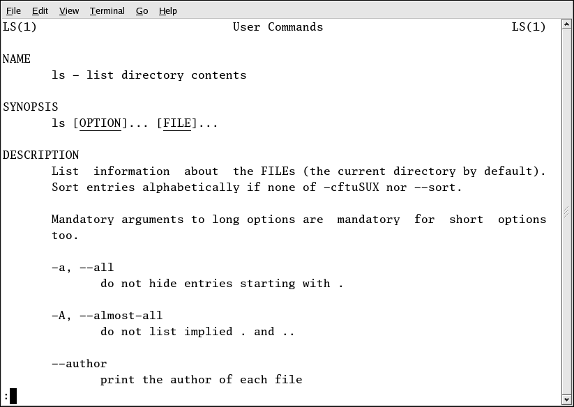 Applications, utilities, and shell prompt commands usually have corresponding manual pages (also called man pages) that show the reader available options and values of file or executable. Man Pages are structured in such a way that users can quickly scan the page for pertinent information, which is important when dealing with commands that they have never previously encountered.