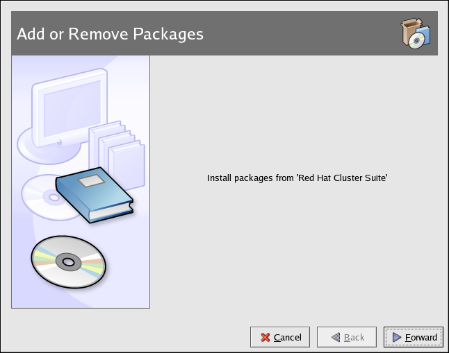Insert the Red Hat Cluster Suite CD in your CD-ROM drive. If you are using a graphical desktop, the CD will automatically run the Package Management Tool. Click Forward to continue.
