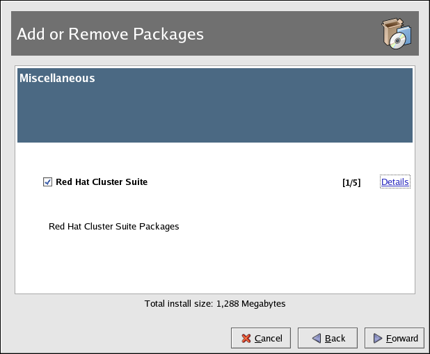 Check the box for the Red Hat Cluster Suite, and click the Details link to the package descriptions.