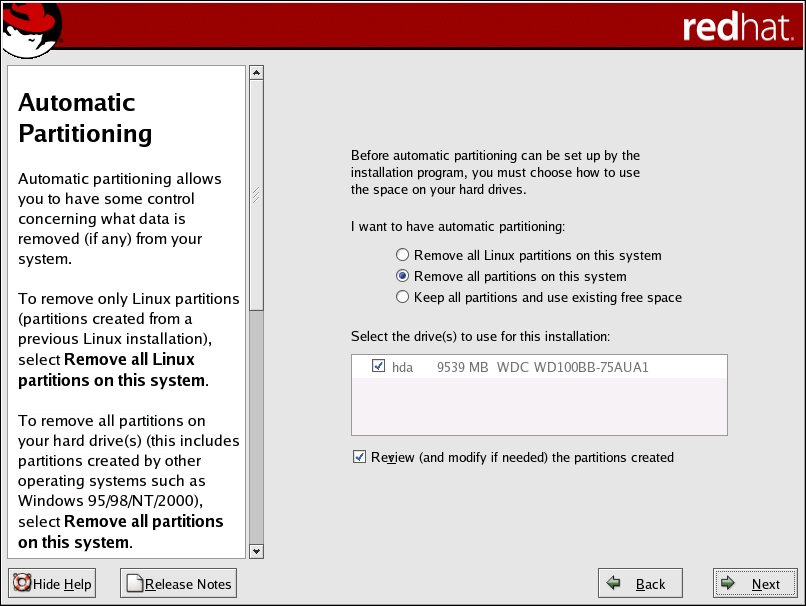 Remove all partitions on this system — select this option to remove all partitions on your hard drive(s) (this includes partitions created by other operating systems such as Windows VFAT or NTFS partitions).
