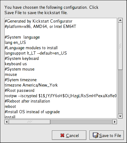 After saving the file, refer to Section 1.10 Starting a Kickstart Installation for information on how to start the kickstart installation.
