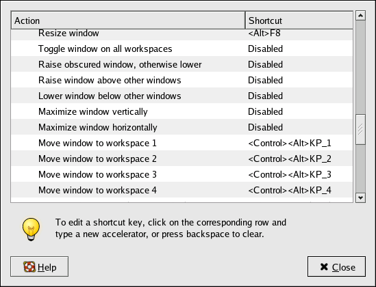 You can create keyboard shortcuts — pressing a combination of keys on the keyboard — to perform actions within an application or on your desktop. Open the Keyboard Shortcuts application from the Applications => Preferences sub-menu. The application provides a list of every action to which you can assign a shortcut. It might be helpful to spend a few moments looking at the default shortcuts; using them can be a great time-saver. Scroll through the list until you find the action you would like to assign a shortcut. Click once on the description of the action, and then press the keystrokes that you would like to use as a shortcut.