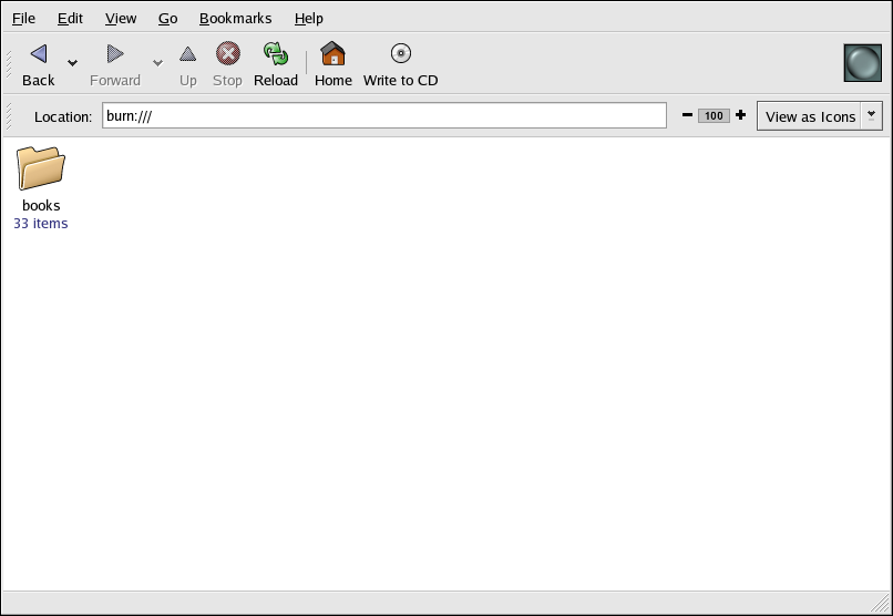 CD/DVD Creator allows you to drag and drop files from a Nautilus window to the CD/DVD Creator interface. To access the CD/DVD Creator feature in Nautilus, insert a blank CD-R(W) into your drive and the CD/DVD Creator window automatically starts. You can also open CD/DVD Creator from a Nautilus window by selecting Go => CD Creator.