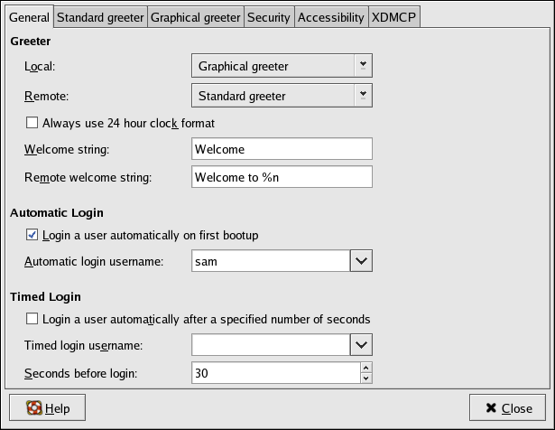 For more detailed information regarding the configuration of gdm, the Gnome Display Manager, refer to the Gnome Display Manager Reference Manual available within the online help system through Applications (the main menu on the panel) => Help, in the Desktop Category. |