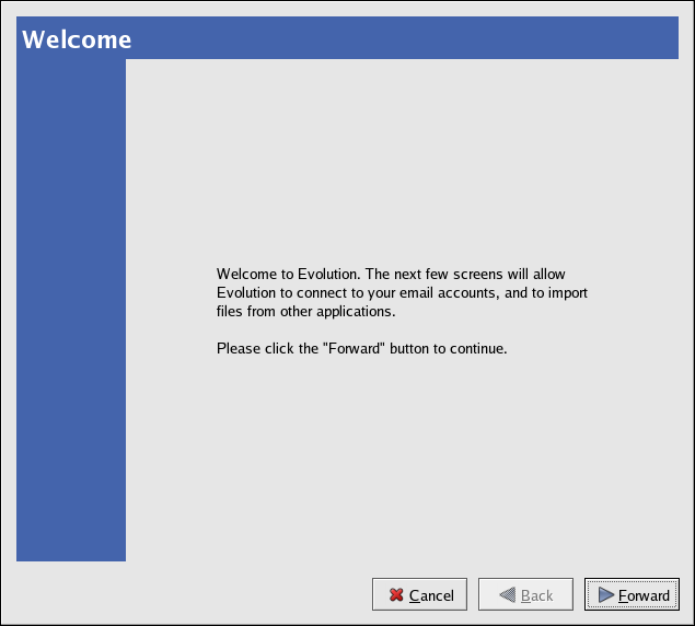 The first time you start Evolution you are presented with the Welcome Screen (Figure 7-1), which allows you to configure your email connection. Follow the on-screen instructions and fill in the information you collected from your ISP or administrator in the text boxes provided. When you are done, click Finish. Evolution proceeds to the Main Screen as shown in Figure 7-2.
