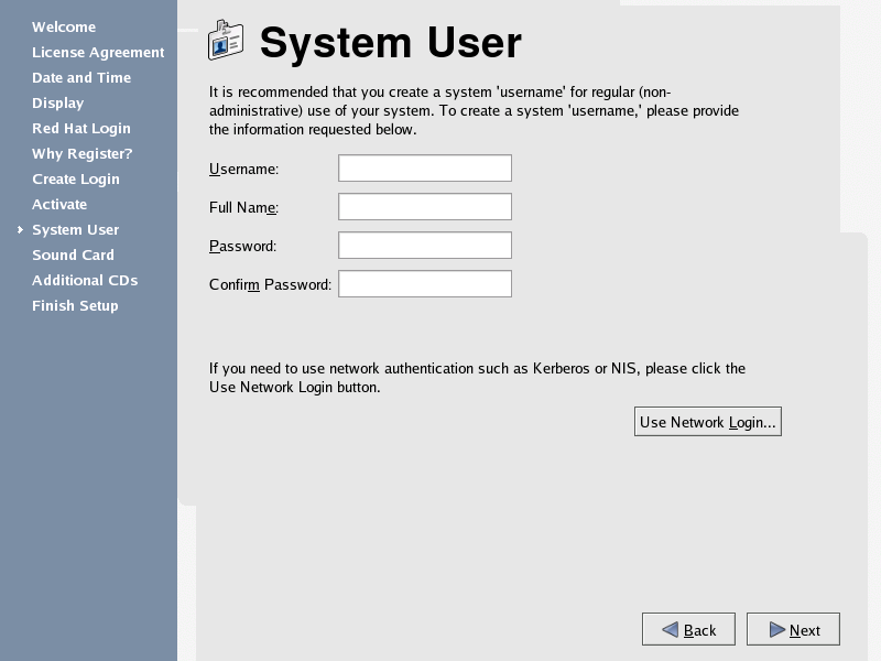 Next, you should create a user account to use on a routine basis. It is not recommended to log in to your root account for common computing tasks, as you may damage your system or unintentionally delete a file. The Setup Agent lets you enter a username, an optional full name for the account, and a password (which you must enter twice). This creates a user account that you can use to log into your Red Hat Enterprise Linux system and which has its own home directory on the system to store files.