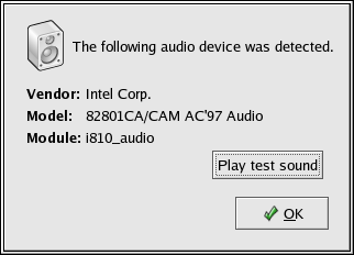 To use the Sound Card Configuration Tool, choose Applications => System Settings => Soundcard Detection. A window opens, prompting you for your root password.
