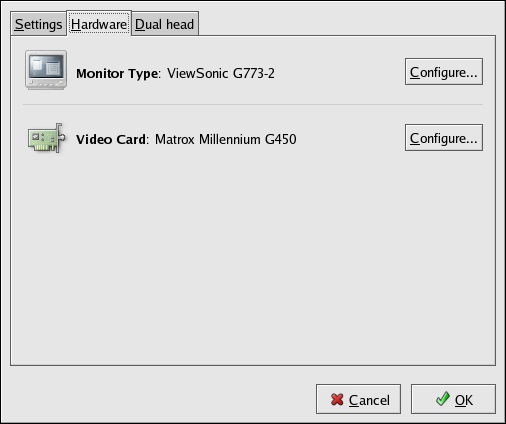 To configure your monitor manually, click the Hardware tab, then click the Configure... button next to the Monitor Type entry. A pop-up window displays a list of monitor models. Choose your model and click OK. You can also let the X Configuration Tool probe your monitor for the correct model and vertical/horizontal frequency settings.
