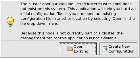 If this is the first time you have started the Cluster Configuration Tool, the program prompts you to either open an existing configuration or create a new one. Click Create New Configuration to start a new configuration file (refer to Figure 3-3).