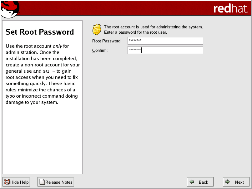 | [1] | A root password is the administrative password for your Red Hat Enterprise Linux system. You should only log in as root when needed for system maintenance. The root account does not operate within the restrictions placed on normal user accounts, so changes made as root can have implications for your entire system. |