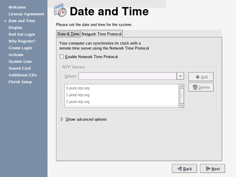 You may also synchronize your date and time automatically with a network time server — a computer that sends accurate date and time settings to your system through a network connection. Select, the Network Time Protocol, check the box labeled Enable Network Time Protocol, and use the drop-down menu to select a time server. Once you have set your time and date, click Next to continue.