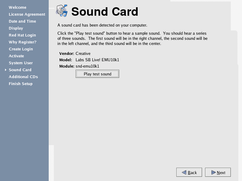 The Setup Agent probes your system for sound cards and attempts to configure the correct settings for use with Red Hat Enterprise Linux. You can then click the Play test sound button to play a sound sample. If you can hear the sample, select OK and your sound card configuration is complete.