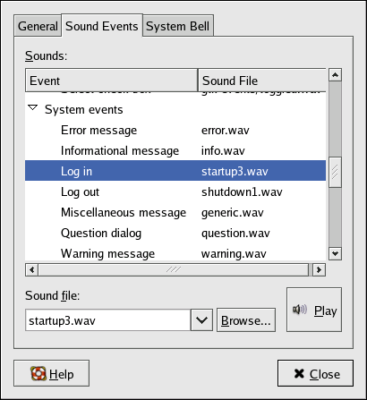 Click on the Sound Events tab, to display a list of actions that can be accompanied by a sound. To change or add a sound to an event, click on the description of the event, then click on the Browse... button. Choose a sound located in the file system, and then click Open. Sound files installed with Red Hat Enterprise Linux are located in /usr/share/sounds/. You may also choose a sound file from your home directory. Any file with a .wav extension can be used for an event sound. To listen to a sound that has been selected, click the Play button. (If you do not hear a sound, follow the steps in Section 10.3 Troubleshooting Your Sound Card.) When you are finished, close the Sound tool, and your changes are saved.